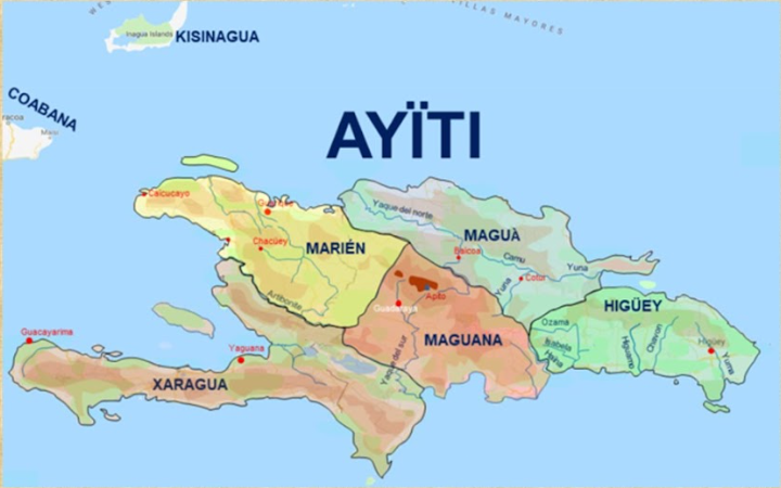 Ayti était divisée en cinq caciquats (départements), dont le Xaragua où se trouve actuellement la ville de Port-au-Prince était dirigée par une femme(après le décès de son mari Caonabo) : ANACAONA.